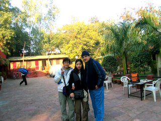 Na descida em Agra, um horror. Sou cercado por vendedores e cambistas que a todo custo querem me levar para algum hotel. No tumulto, encontro duas estudantes sul-coreanas, Kim e Won (acho que com menos de 20 anos de idade), que aparecem na foto acima. Elas estão apavoradas com o cerco e se juntam a mim. Falam menos inglês que eu. Vamos ao guichê de informacões, telefonamos para o hotel Sheela, que fica a 200 metros do Taj Mahal e a 15 quilômetros da estação ferroviária. Ninguém atende. Os cambistas dizem que está lotado. Decidimos correr o risco e ir ate lá. Alugamos um riquixá motorizado prepago por 62 rúpias e nos lançamos a aventura pelas ruas escuras. No riquixá cabem dois. Sentamos os três com as respectivas mochilas e acessórios no colo. Só nossas cabeças de fora. Um frio de cortar. A pequena carruagem é aberta.