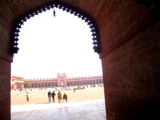 Hoje fui às ruinas de Fatehpur Sikri, no conforto de um automóvel. Se fosse de riquixá certamente teria piorado do resfriado, pois em todo lugar há poeira demais. Em Fatehpur acabei contratando um guia local, que me falou sobre a mesquita, o túmulo sheik Salim Chishti, sobre o palacio real, etc. O rapaz ainda me ajudou a fazer fotos. A Fatehpur histórica é uma cidade-fantasma. Foi habitada durante apenas 20 anos. Uma seca longa, que acabou com a água na região, tornou-a inóspita demais. Mas hoje é um local importante para os muçulmanos da Índia. Sua linda mesquita, mesmo desativada, atrai fiéis, inclusive sufis.