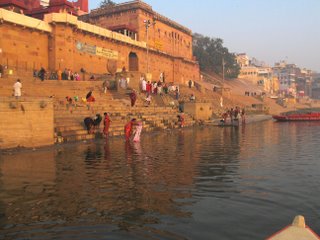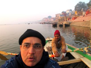 Percorremos o Ganges na alvorada, ao longo dos muitos ghats, o barqueiro explicando explicando sobre cada um deles (o mais importante e o Dashaswamedh), sobre os templos e os palácios edificados por antigos marajás, hoje sujos e abandonados. Há uma pequena multidão de pobres, muito pobres, devotos já se banhando nas águas poluídas desse trecho do Ganges. Ali se escova os dentes, se bebe a água. Fotografo tudo. Os meus amigos de passeio me ajudam. Mas tenho de guardar a máquina quando chego ao primeiro ghat de cremação. Ja há corpo sendo queimado. E proibido fotografar nos templos e nesses ghats. Fotografo o lindo nascer do sol no Ganges, um momento especial para turistas e para fiéis.