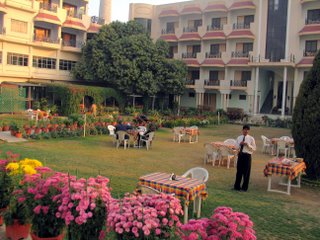 O Surya é um hotel elegante e confortável (umas 3-4 estrelas no Brasil), tem um jardim central muito bonito, apartamentos com um certo luxo e com água quente a toda hora (uma raridade na Índia), além de um restaurante requintado instalado num antigo palacete que pertenceu ao rei do Nepal. Como me sentia fraco, resolvi burlar minha dieta vegetariana (na India, a comida vegetariana é básica, mas é fraca, sem soja). Comi um prato com pedaços de frango. Não tinha hot spice (molho picante). Pois bem, na madrugada tive diarréia. Acho que o molho picante protege contra bactérias.