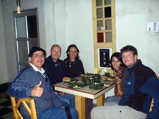 Acordo cedo, às 5h. Comprara um bilhete para um passeio guiado à Old Varanasi (Varanasi antiga), incluindo um trajeto de barco no rio Ganges (ao longo dos ghats, as escadarias onde os devotos se concentram) e uma visita à Universidade Hindu e templo de Durga. Encontro, ainda na escuridão da madrugada, um casal da Nova Zelândia que eu vira rapidamente no trem (Dougal e Sonya McGowen), juntamente com um casal de holandeses (Tomas Simons e Martha), todos jovens mochileiros (na foto à direita estamos no café Bread of Life, os neozelandeses ao meu lado). Eles se aquecem em torno de uma pirâmide de fogo junto com funcionários do hotel. Aqui o fogo está presente em tudo, nas cerimônias dos templos e nas portas de casas.