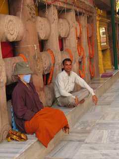 Na entrada do templo paguei 20 rupias e aceitei os serviços de um rapaz sorridente e muito prestativo, Habi, que foi meu guia na área do templo e ajudou-me nas fotografias. Os budistas são mais harmônicos, silenciosos, seus ritos não têm a barulheira do hinduismo (lindos também). Mas os hindus estão aqui e, enquanto os monges entoavam mantras, numa solenidade de reflexão sobre a impermanência de todas as coisas,(foto à esquerda) um grupo de hindus recitavam versos do Bagavad Gita e preparavam alimentos para serem oferecidos as deidades em memória de seus pais e avós. Fotografei tudo. Mesmo trabalhando e, portanto, com um pouco de pressa saí do templo sentindo muita paz. Paguei o dobro ao Habi ( na foto à direita, ao lado da coreana de máscara, junto à Bodhi Tree), que ainda comprou uma meia nova para mim, pois ao retornar ao guardador de sapatos (Shoes House), tinha as meias brancas totalmente pretas e enlameadas.