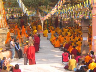 Estou em Bodhgaya, a 13 quilômetros de Gaya, digitando estas anotações em frente ao Mahabodi Temple, que visitei nesta tarde. Vim num riquixá apertado, improvisdado como uma pequena camioneta, movida por um motor de lambreta! Mais de 10 pessoas, como numa lata de sardinha. Insisti para trazer minha bagagem comigo e não no bagageiro inseguro. Bodhgaya é um santuário budista, venerado também pelos hinduistas, que vêem Buda como uma encarnacao de Vishnu. Hoje assisti a uma linda celebração junto à Bodhy Tree, a árvore sob a qual, há 2500 anos, Buda alcancou a iluminação. Milhares de monges (muitos jovens) sentados em posicao de lotus, no imenso jardim, entoando o famoso mantra Om Mani Padme Hum, um grande espetáculo espiritual.