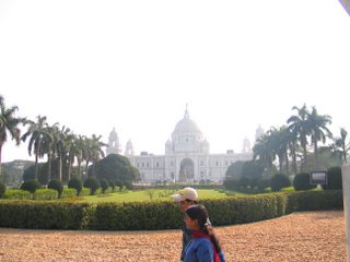 Voltamos ao metrô e fomos para o Memorial Victoria (foto à direita) , um lindo palácio imperial, do tempo dos ingleses, fechado nesta segunda-feira. Mesmo assim, havia uma fila enorme de pessoas comprando ingressos apenas para passear nos jardins. Preferi dar uma volta de carruagem no parque em frente. As fotos contra o sol não ficaram boas. Já no final do tarde, fomos a um bom restaurante, na área do Parque Elliot, comemos comida israelense (ou seria grega?) - chamada pita. Fui rapidamente a uma das boas livrarias e a uma casa de Cds e DVds e voltei para a área do meu hotel.Calcuta e uma cidade enorme. Tem aparência ocidental na área central, mas o toque indiano está na pobreza da periferia, nas pessoas andando até mesmo nuas nas ruas, no trânsito caótico, feito por luxuosos automoveis Ambassador (a frota amarela de taxis e imensa), ônibus e bondes caindo de velhos. No centro, nenhum autoriquixas. Em compensação, há riquixas com tração humana. Isto mesmo: carruagens puxadas por homens muito pobres, uma caracterista única da cidade.