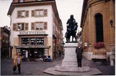 JM e a estátuta de Pestalozzi, em Yverdun, na Suíça