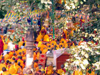 O coro de vozes graves ecoa no meio da tarde e a cidadezinha empoeirada parece hipnotizada pela sinfonia. Om mani padme hum, Om mani padme hum (pronuncia-se Omêni-péme-um), repetem sem cessar milhares de monges sentados no chão, pernas cruzadas, ocupando os jardins em torno do templo Mahabodhi. Suas vestes vinho e alaranjada, as cabeças raspadas, as bandeirinhas multicores penduradas em varais, os fiéis praticando prostrações, a fumaça e o cheiro de incenso espalhados pelos quatro cantos completam esse quadro de som e cores, quase etéreo, no lugar mais sagrado do budismo. Que sorte! Cheguei a Bodhgaya em um momento especial: o da cerimônia final da visita da Cagiupay Sangha, evento anual que reúne monges e exilados tibetanos – e, não raro, o próprio Dalai Lama – ao pé da Bodhi Tree, a figueira sob a qual o príncipe Sidarta meditou e alcançou a iluminação.