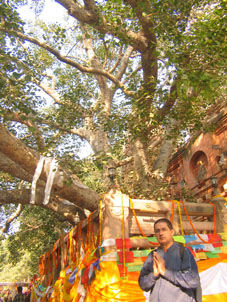 JM sob a Bodhi Tree, a árvore que atrai milhares a Bodhigaia