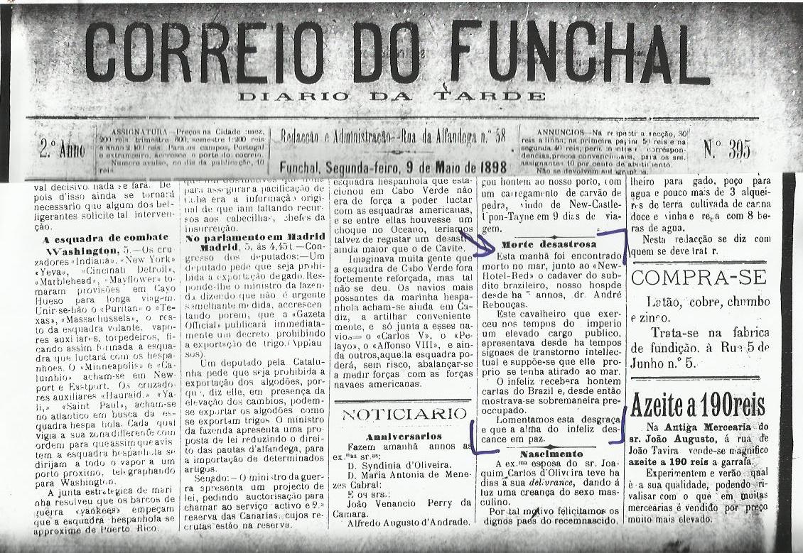 “Rebouças”, é o título da notícia do Diário. "Deu entrada na casa mortuária da Escola Médico-Cirúrgica do Funchal, ontem, pelas dez horas da manhã, o cadáver do engenheiro Rebouças, antigo familiar e amigo dedicado do velho D. Pedro 2º, imperador do Brasil. Vivia há anos no Hotel Reid, ao Salto do Cavalo, onde se recolhera desde que o seu velho amigo descera os degraus do trono. Não sabemos se a morte foi devida a propósito ou a desastre. Parece que o cadáver fora encontrado no mar, próximo ao hotel onde vivia, sendo certo que todo o fato se achava bastante molhado, e assim o vimos naquela casa. Era homem muito ilustrado e distinto escritor, não sendo menos notável a sua extrema modéstia e quase segregação completa de convivência, ainda com os que viviam sob o mesmo teto."