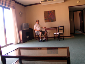 Eu havia reservado pela Internet um apartamento do Hotel Excelsior Inn, anexo do luxuoso Hotel Excelsior, então em temporada de ofertas. O preço era alto para um mochileiro (100 dólares), mas eu presumia que àquela altura eu deveria estar muito cansado (eu viajava de ônibus) e mereceria um certo conforto para poder restaurar as energias e seguir adiante. Ao chegar ao hotel fui informado que o estabelecimento estava lotado, pois uma grande empresa brasileira decidira realizar ali sua convenção. A gerência do hotel, no entanto, gentilmente presenteou-me com a hospedagem na única área que não havia sido ocupada: uma penthouse, no caso uma suíte de sete dependências e varanda na cobertura do hotel, com vista do centro e área histórica de Assunção. Constrangido (de verdade), aceitei e fui sozinho para aquele desperdício.