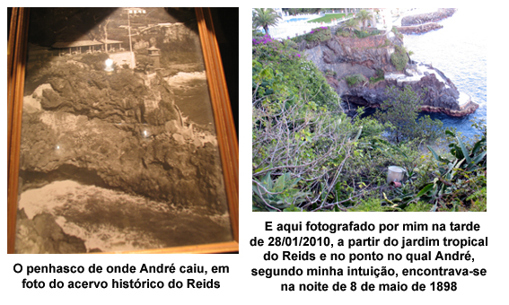 Logo depois, com a permissão que me foi dada para visitar as instalações do hotel, pude inspecionar o penhasco, chegando a intuir o local onde André poderia ter caído (não encontrei registros em documentos sobre esse detalhe), mas em seguida fui assaltado por dúvidas, pois o rochedo estava verde e florido em sua parte superior e em algumas brechas arenosas da escarpa e a imagem de minha infância era a de a uma rocha escura, praticamente sem vegetais.